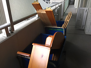 まずは傷さけパッドを敷いて床や壁を保護いたしました。ベッドは解体可能でしたので、その場で解体してから運び出します。マンションにお住まいですので、下の階などに影響のないよう慎重に行いました。お部屋からは台車で運び出していきました。
